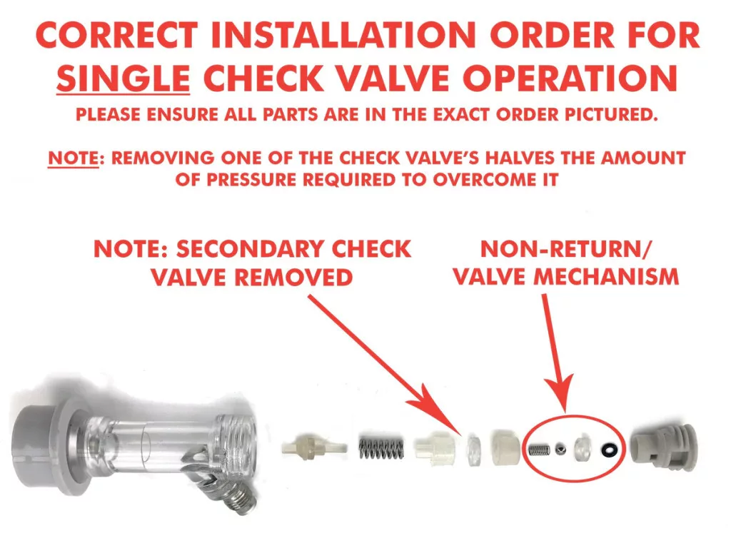 Kdo se věnuje stáčení piva, jistě se setkal s tím, že při nesprávném pořadí odtlakování systému se mohla kapalina dostat do potrubí na straně plynu. V extrémních případech se to může dostat až k redukčnímu ventilu nebo inline regulátoru. Drobné částice se mohou kvůli obsahu cukru v pivu zaseknout a jejich fungování se stane nespolehlivým. V extrémním případě může systém s zaseknutým redukčním ventilem představovat nebezpečí pro život. Aby tomu předejít, je vhodné do systému namontovat zpětný ventil. Ten zabrání tomu, aby pivo proudilo do potrubí na straně plynu.