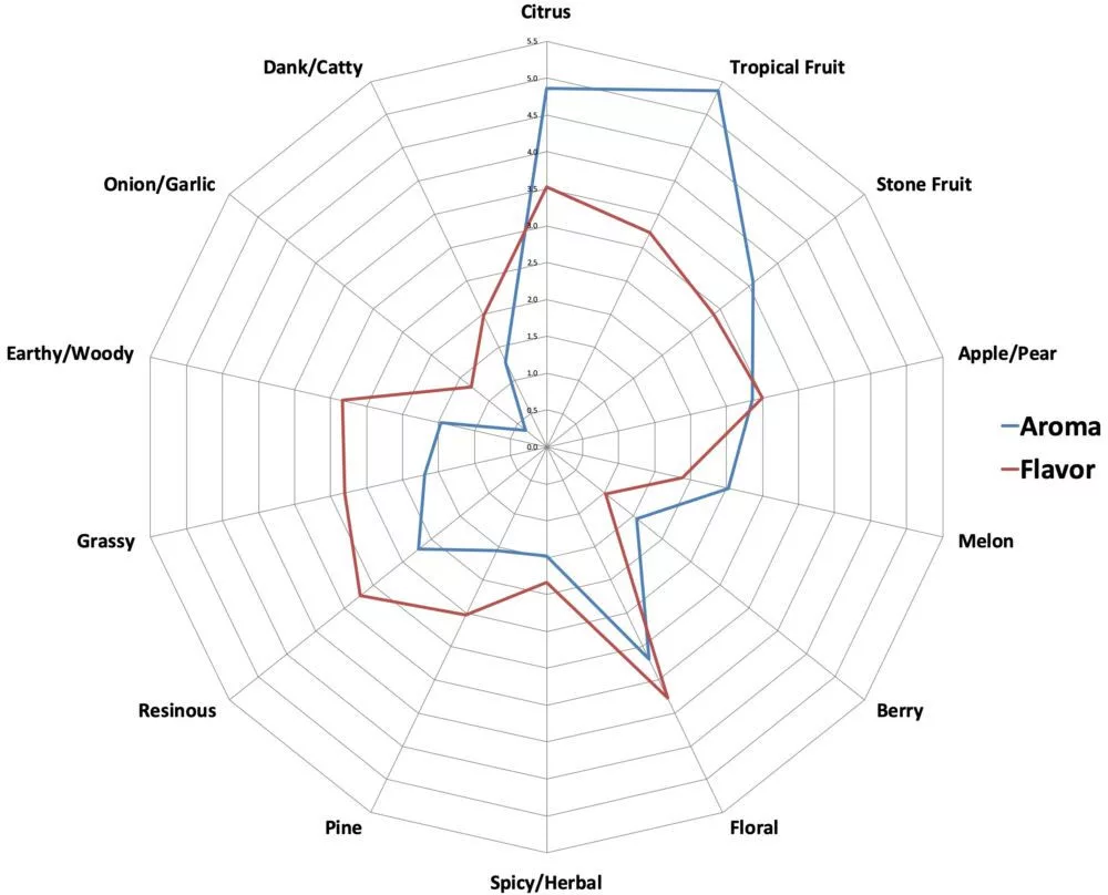 Sabro® pěstovaný v údolí Yakima má silné aroma. Jeho aroma má citrusové, mandarinkové, tropické ovocné a kokosové tóny, ale v některých případech jsou cítit i tóny vanilky a kopru. Dobré je podívat se také na toto: Zde si můžete přečíst celý popis (anglicky)