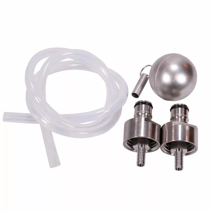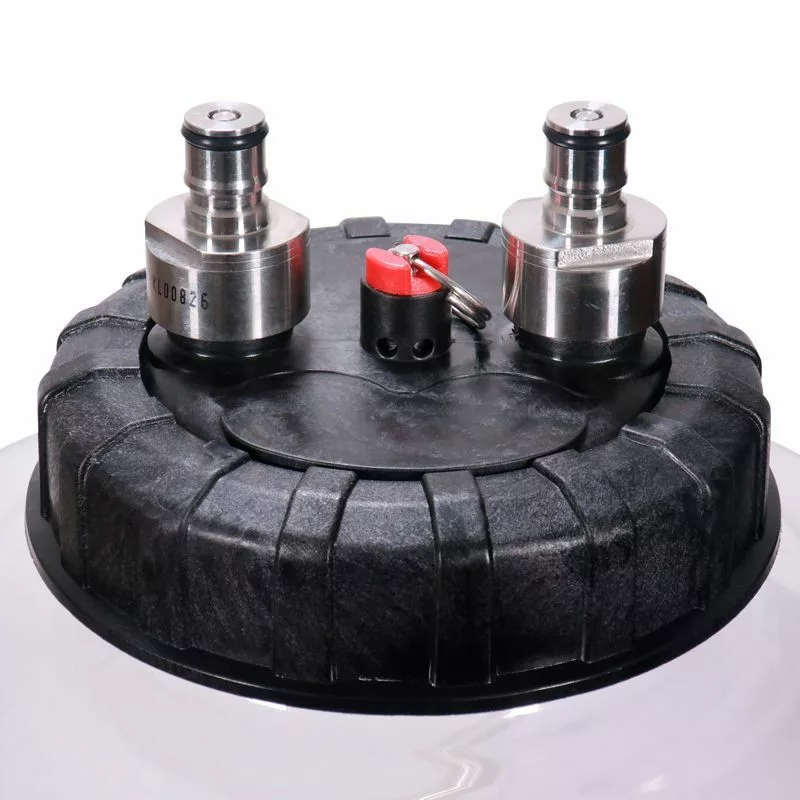 - 2 nerezové hlavice, na které lze připevnit standardní kegový ball lock, které se našroubují na dva závity na víku Fermzilly