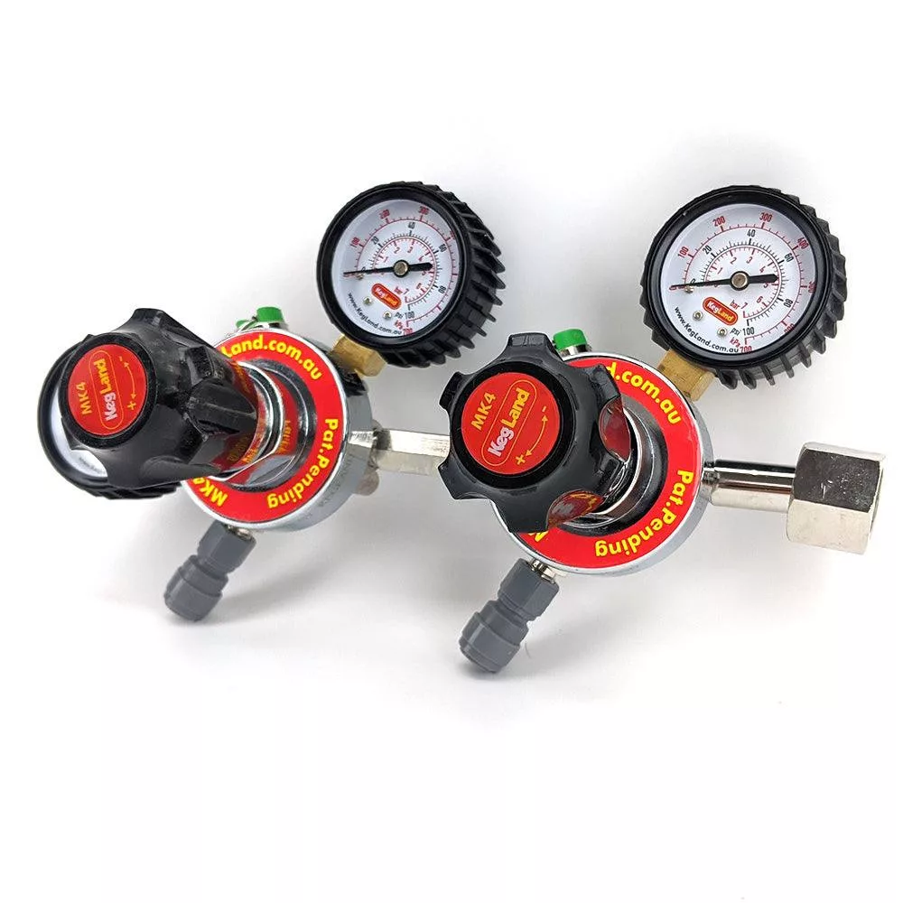 Duální redukční ventil pro CO2 láhev. S tímto redukčním ventilem můžete současně sycenat dvě piva při různých tlacích. Nebo můžete připravit jedno pivo a jednu sodu najednou.