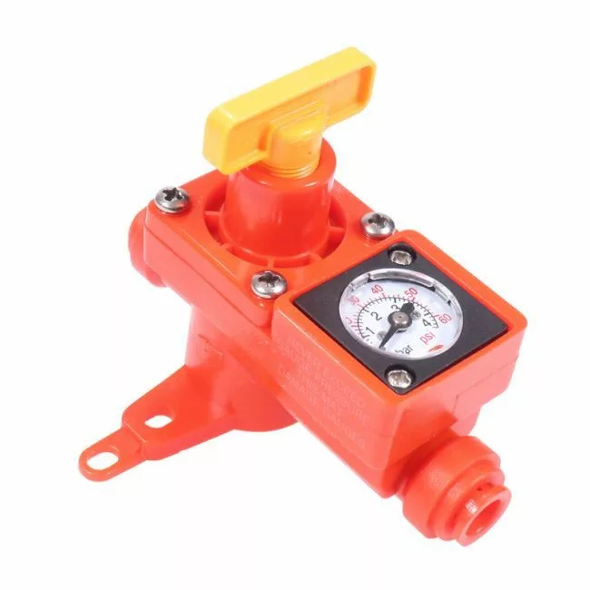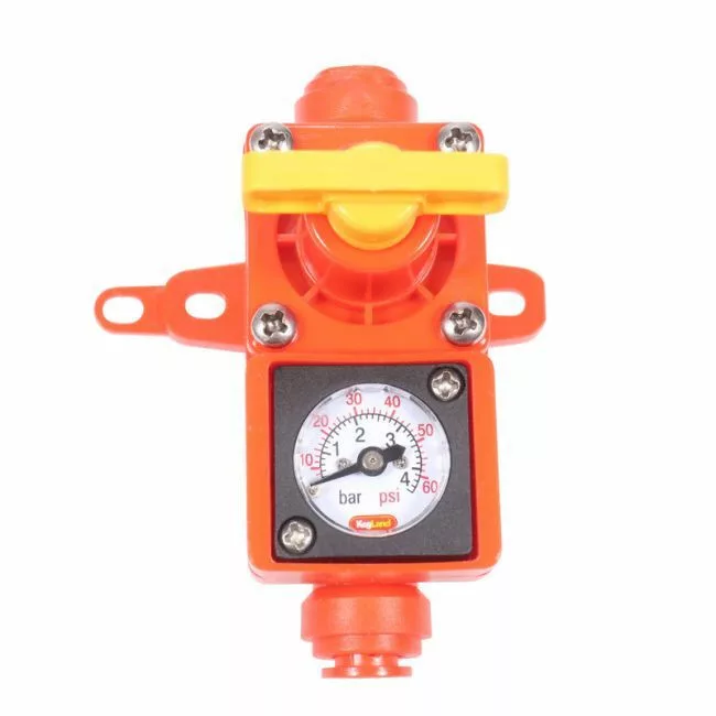 Vestavěný manometr pracuje v rozsahu 0–1 bar/0–15 psi, tlak lze zvýšit otočením středového žlutého šroubu doprava a snížit otočením doleva.