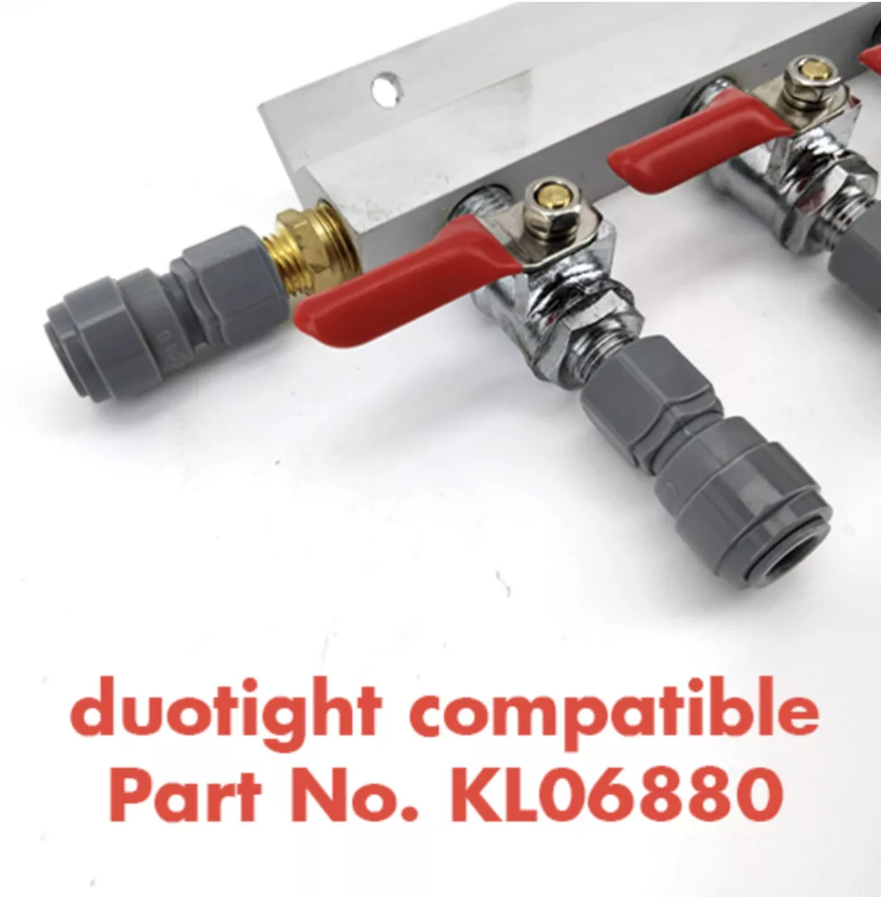 Rozvaděč na straně plynu s 3 výstupy ¼” a 3 kulovými kohouty 1/4” s závitem MFL. Rozvaděč je kompatibilní s armaturami Doutight.