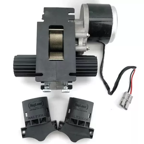 Je vybaven vestavěným 24V motorem, který je dostatečně silný, aby snadno rozdrtil odskakující sladová zrna. Někteří výrobci mlýnů vyrábějí obilní mlýny z oceli. V některých jiných kvalitních mlýnech se ocel kalí, takže zuby zůstávají déle ostré a déle zachycují zrna. Někteří další výrobci se snaží tento problém vyřešit použitím ozubených válců, takže válce o něco lépe zachycují obilí, nebo používají 3 válce, kde první dva válce s většími mezerami tlačí obilí do třetího válce. Tyto možnosti podle našeho názoru neřeší skutečný problém, že se tyto ocelové válce otupí, zejména při drcení tvrdých zrn. Diamantový mlýn MaltZilla má zcela odlišnou konstrukci a je prvním na světě, který využívá diamanty impregnované do povrchu válců. Tyto diamanty zůstávají stejně ostré jako první den, i poté, co mlýn zpracoval mnoho tun obilí.