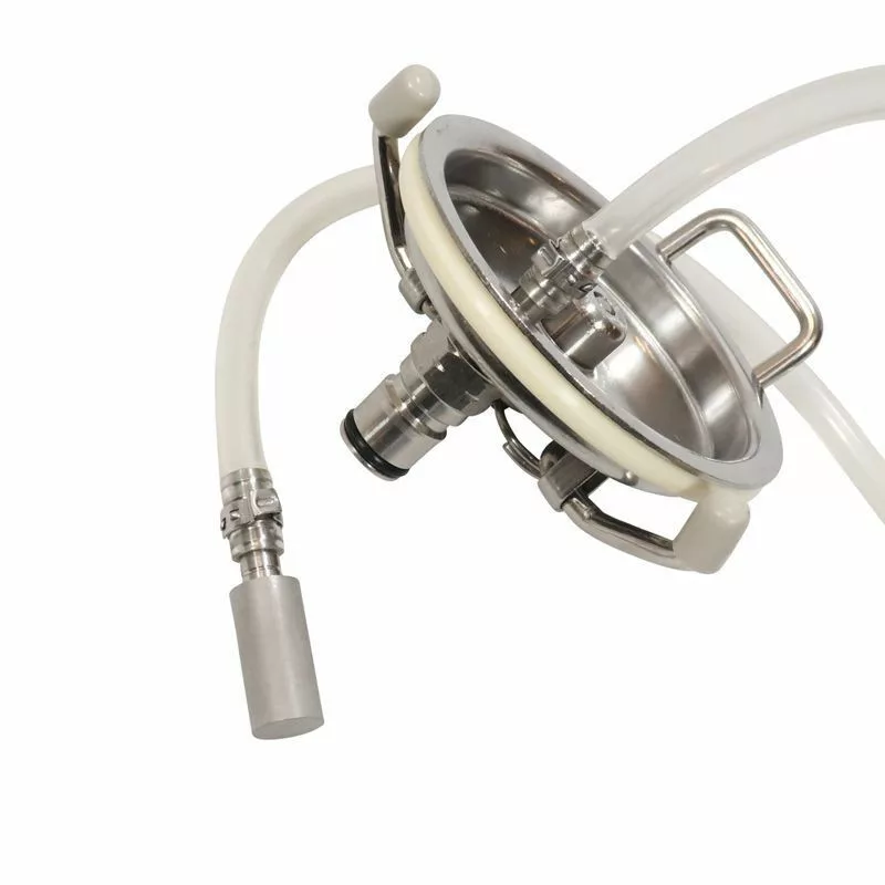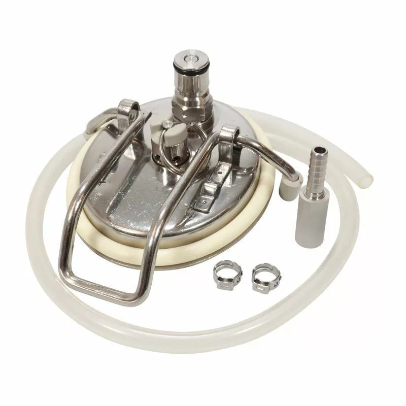 Víčko Corny s vestavěným 0,5mikronovým karbonizačním kamenem a trubkou o průměru 60 mm. Trubka snadno dosahuje až na dno sudu, takže karbonizace piva probíhá velmi rychle a snadno.