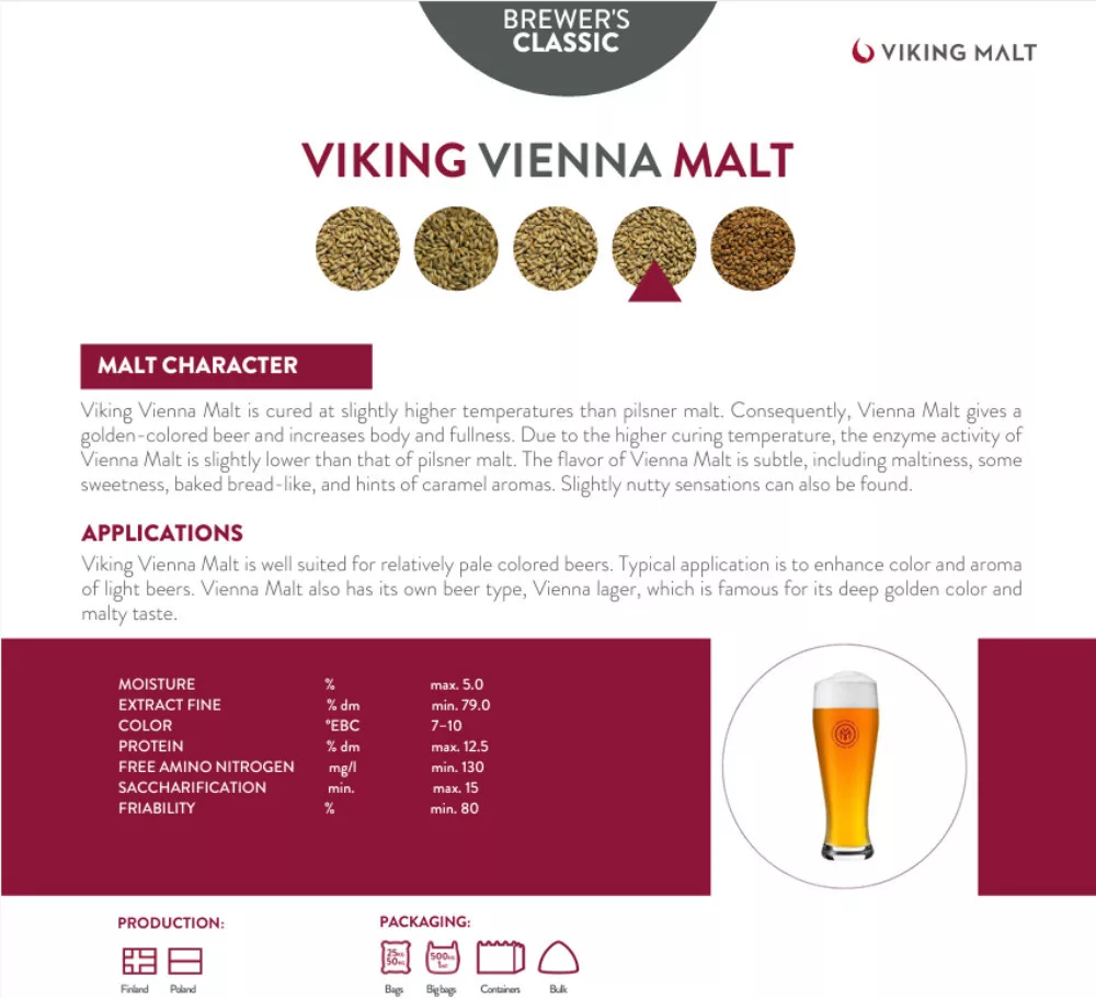 A Viking Vídeňský slad vynikající kvality základní slad, který se suší při o něco vyšší teplotě než plzeňský slad. Díky tomu dodává pivu sytější zlatou barvu, plnější tělo a bohatší aroma. Ačkoli je jeho enzymatická aktivita o něco nižší než u plzeňského sladu, je přesto perfektní volbou, pokud je cílem obohatit barvu a chuť piva.